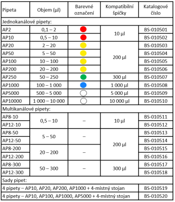 Vícekanálové pipety se vyrábí ve čtyřech objemech: 0,5-10 μl, 5-50 μl, 20-200 μl, 50-300 μl.